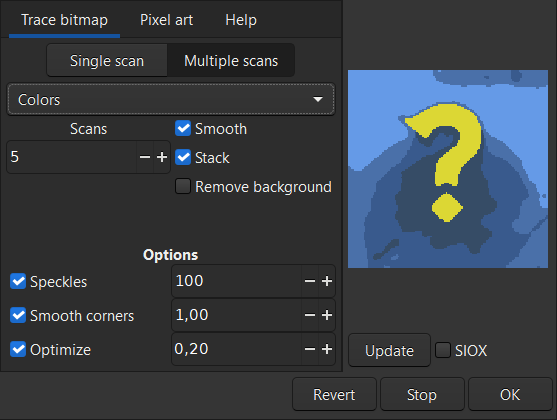 The Trace Bitmap window allows you to finetune the tracing, by changing settings and clicking Update after each modification. I will not be going into too much details, as the SVG graphic that I want to create is not of great importance. It would also be possible to only focus on the question mark, but after some consideration I actually would like to keep the background.