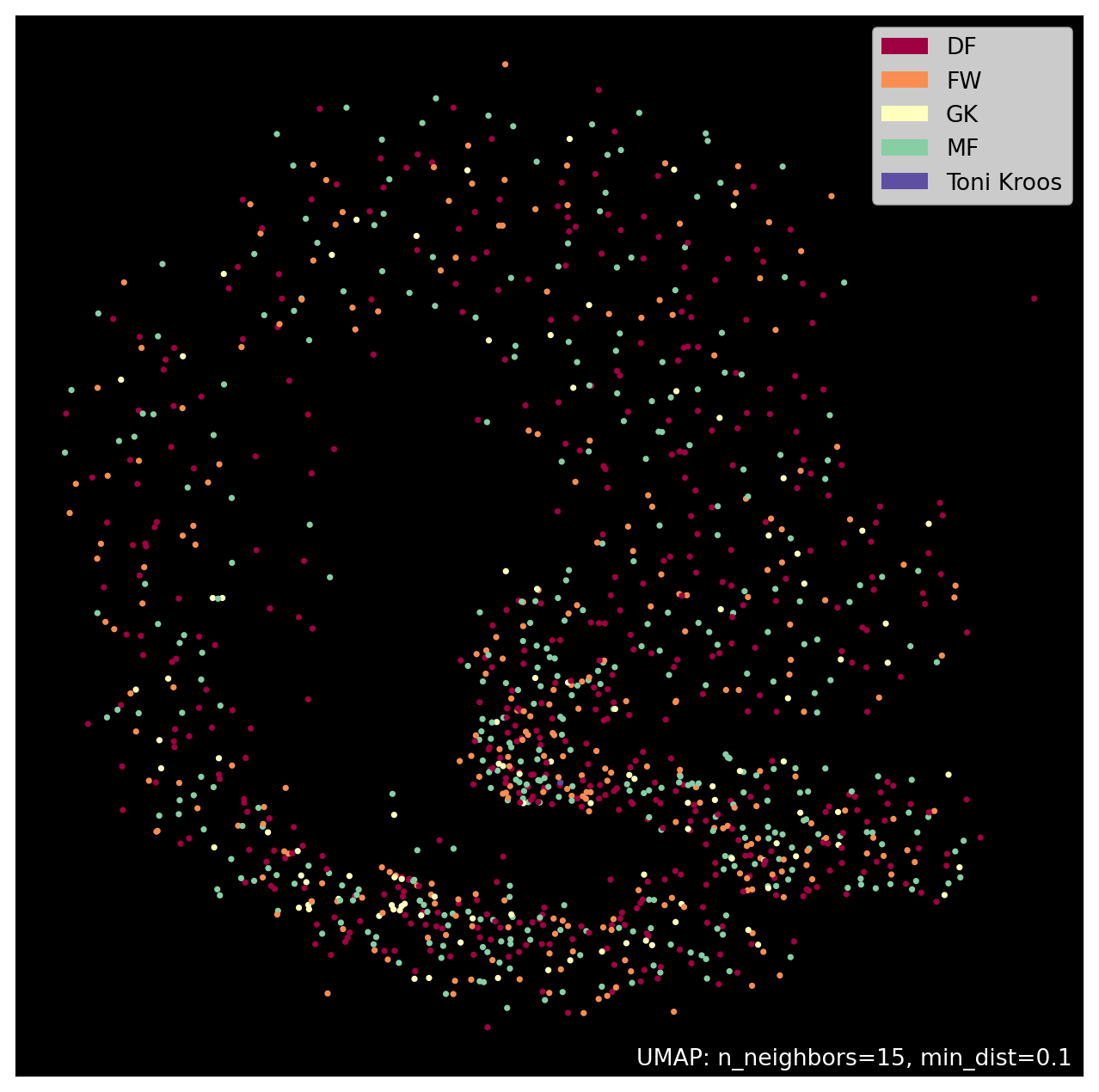 If you have watched any of Real Madrid’s first few games in this season (2024/2025) and also previous seasons, you must have noticed a hasty and uncontrolled playing style in recent games. Very clearly this is due to the absence of Toni Kroos in midfield, and you don’t have to be a tactico to observe that. Even though he is truly one of a kind, I would like to use football data to find the most similar player in terms of statistics. A recent trip to PyData Amsterdam 2024 and the talk of Jeroen Janssens about ‘How I hacked UMAP and won at a plotting contest’ has inspired me to try and play around with Polars for a small side project, and this seems like the perfect one! Also the use of UMAP suits this project particularly well.